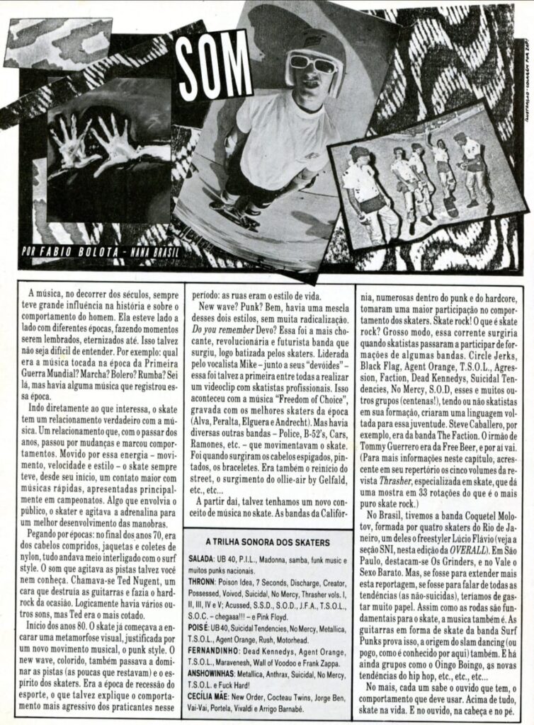 Os anos 80 também foram marcados por uma forte ligação entre skate e música. No Brasil, bandas como Ratos de Porão, Inocentes, Cólera, Flicts e Grinders eram trilha sonora constante das sessões. No cenário internacional, grupos como Dead Kennedys, The Clash, Black Flag, Joy Division e New Order faziam parte da playlist dos skatistas. Essa diversidade musical reforçava o caráter contestador da cultura, misturando o peso do punk com a intensidade do pós-punk e a energia do hardcore.