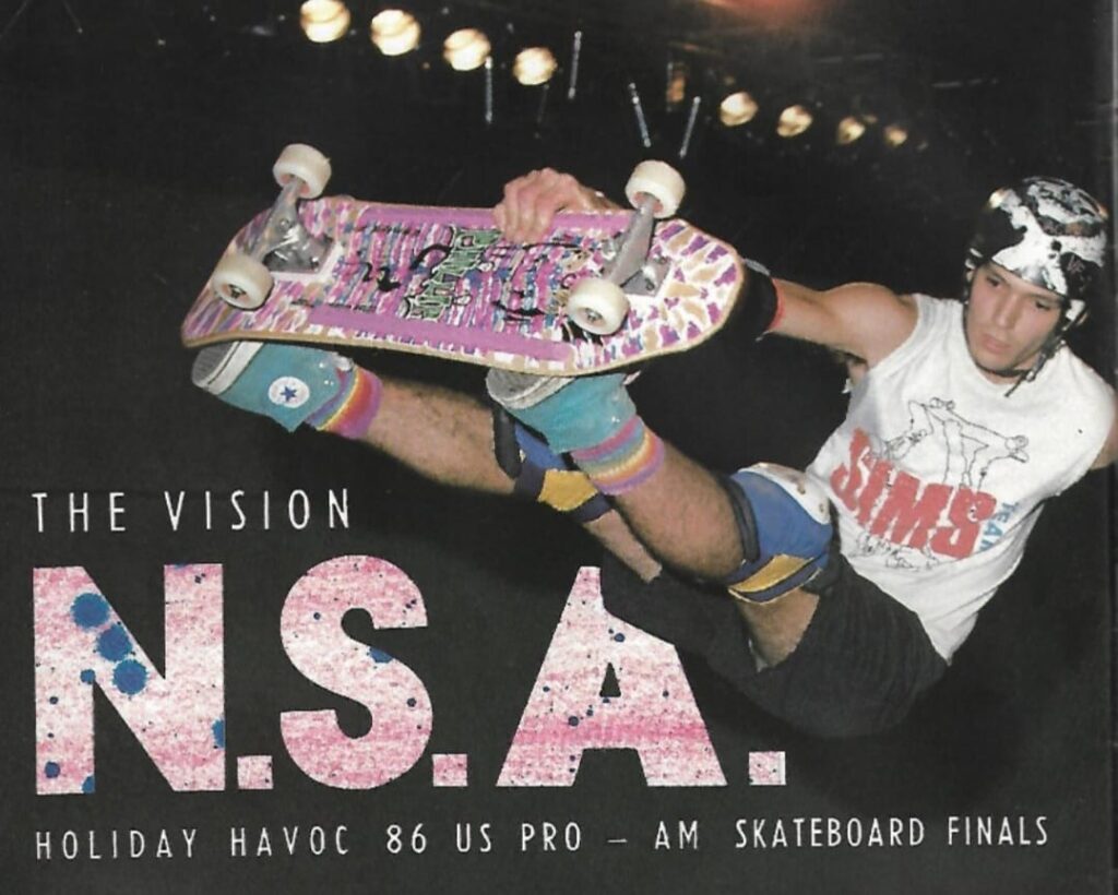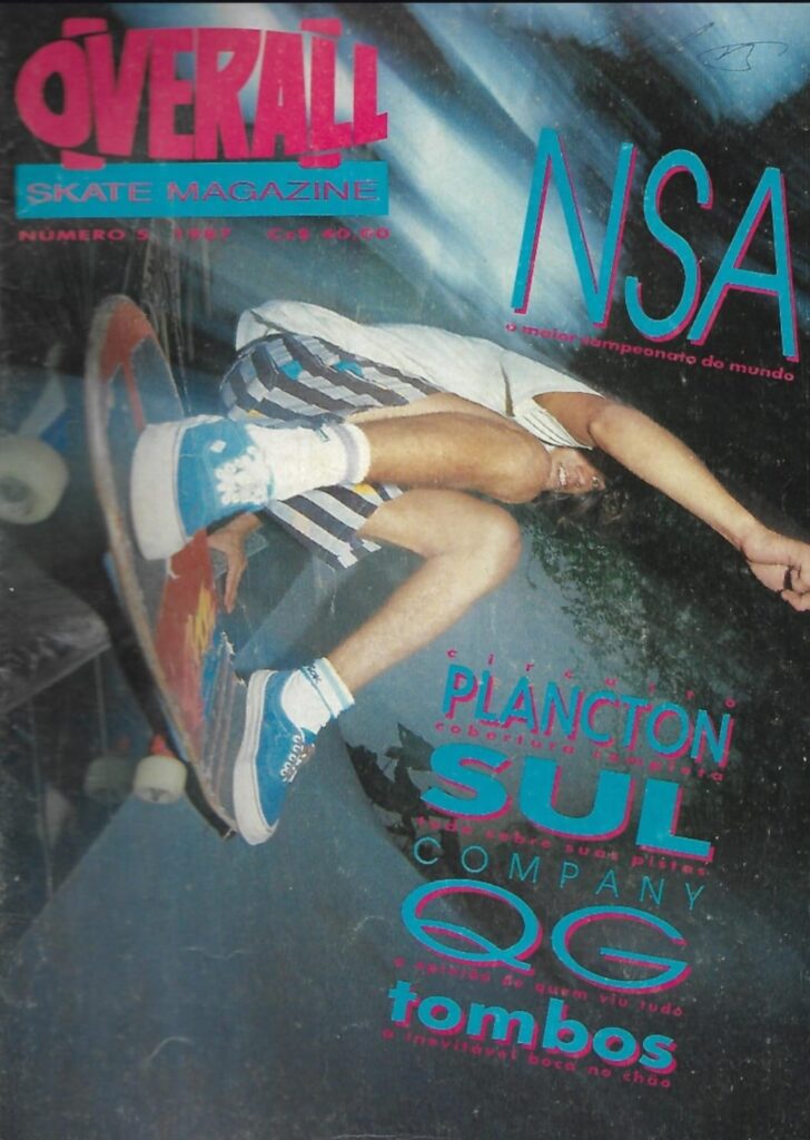 A OVERALL SKATE MAGAZINE, edição 9, é de 1987. Custava Cz$ 40,00. A capa é forte e dinâmica. Mostra o skatista Mauro Mureta no ar. Ele flutua sobre a borda da pista. No entanto, o nome dele não estava na capa. Contudo, o destaque era outro: “NSA – o maior campeonato do mundo”. Portanto, o foco era na conexão internacional.
