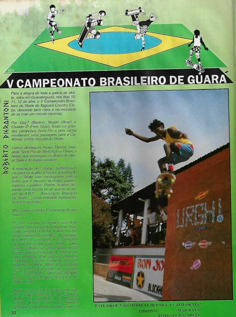 Por fim, na página 30, o V Campeonato de Guará é apresentado como o ponto alto da edição. O evento reuniu os melhores skatistas do país, demonstrando o quanto o nível técnico já havia crescido. E, se havia dúvidas sobre o futuro do skate brasileiro, então Guará mostrou que o movimento estava mais vivo do que nunca. O público lotou as arquibancadas, os atletas deram o máximo e o skate nacional provou sua força diante de todos.