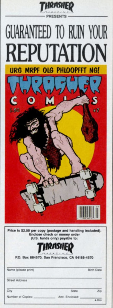 Além disso, havia a matéria “SANTA BARBARIANS” (página 56). Esta missão secreta, com efeito, estava ligada a um gigante corporativo, e era conhecida por seus underground ranks. Na seção DEPARTMENTS, a revista mantinha contato com a comunidade. Tinha MAIL DROP para cartas, SKATING MATERIAL com o diário de Rick Iost, e RUMORS WITH A VIEW. Portanto, a THRASHER se consolidava como uma revista que abraçava o skate em todas as suas formas.