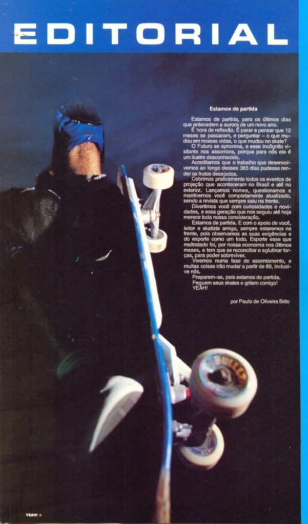 Logo nas primeiras páginas, o editorial intitulado “Estamos de Partida”, escrito por Paulo de Oliveira Brito, chamava a atenção. O texto fazia uma reflexão profunda sobre o ano que terminava e os desafios que o skate enfrentava no Brasil. Paulo questionava o leitor: “O que mudou nesses últimos doze meses?” — uma pergunta simples, mas poderosa, porque levava cada skatista a pensar sobre a evolução do esporte e da comunidade.